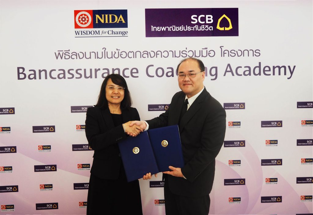 นาย ลี ซี ทียอง รักษาการกรรมการผู้จัดการใหญ่ บริษัทไทยพาณิชย์ประกันชีวิต จำกัด (มหาชน) หรือ SCBLIFE และ รศ.ดร.ระวีวรรณ เอื้อพันธ์วิริยะกุล รองอธิการบดีฝ่ายวิชาการ ผู้แทนอธิการบดีสถาบันบัณฑิตพัฒนบริหารศาสตร์ (นิด้า)ร่วมในพิธีลงนามบันทึกข้อตกลงความร่วมมือ (MOU) โครงการ“แบงก์แอสชัวรันส์ โค้ชชิ่ง อะคาเดมี” (Bancassurance CoachingAcademy) จัดอบรมหลักสูตรด้านการเงิน การตลาดและการบริหารลูกค้าสัมพันธ์เพื่อเพิ่มพูนศักยภาพของบุคลากรฝ่ายขายช่องทางธนาคารไทยพาณิชย์ของบริษัทฯ และสนับสนุนโมเดลการสร้าง “ไลฟ์ โค้ช” (Life Coach)หรือที่ปรึกษาวางแผนสร้างหลักประกันความมั่นคงทุกช่วงชีวิตให้กับลูกค้าธนาคาร ภายใต้นโยบาย “ยึดลูกค้าเป็นศูนย์กลาง”พร้อมขับเคลื่อนสังคมไทยก้าวสู่สังคมประกันชีวิตที่ยั่งยืน ณ หอเกียรติยศอาคารสยาม บรมราชกุมารีฯสถาบันบัณฑิตพัฒนบริหารศาสตร์เมื่อเร็วๆ นี้