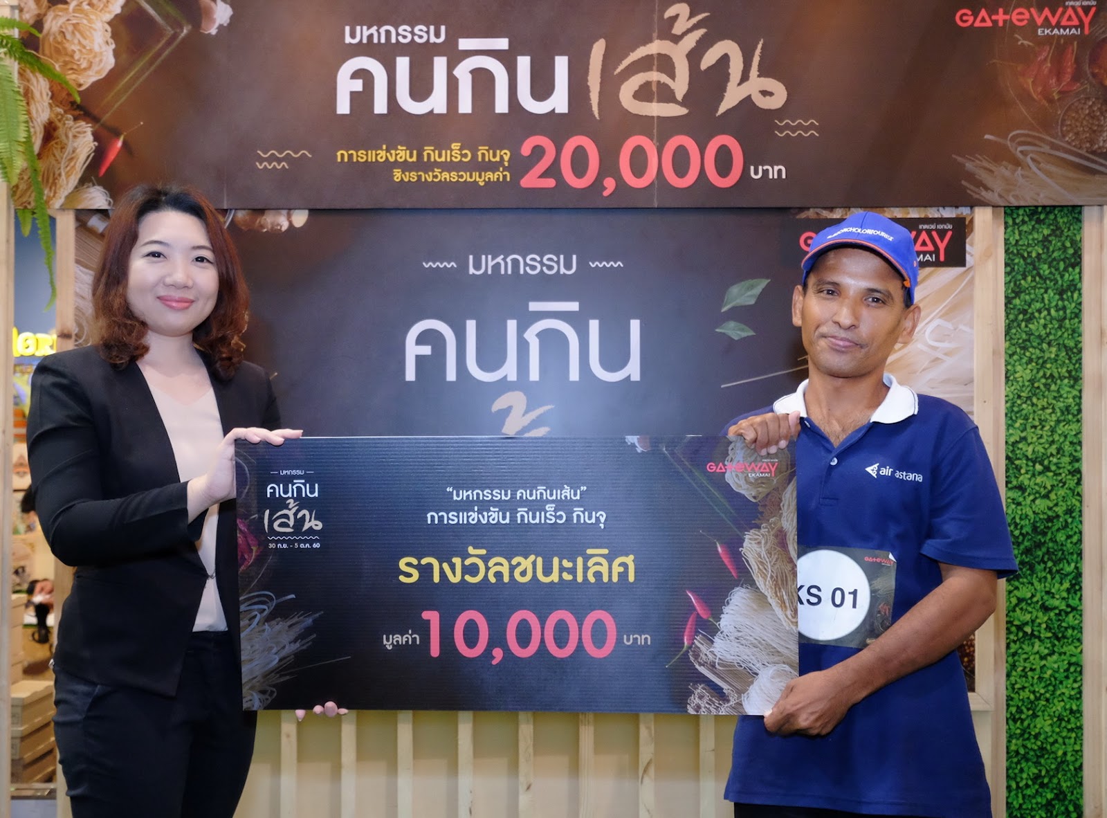 นางสาวภิรดี เจริญรัตนาภิรมณ์ รักษาการผู้จัดการทั่วไป ศูนย์การค้าเกตเวย์ เอกมัย ร่วมแสดงความยินดีกับ นายวรรณชัย วิมลบุญญากร ผู้ชนะเลิศจากการแข่งขัน กินเร็ว กินจุในงาน ‘มหกรรมคนกินเส้น’ ที่คว้าเงินรางวัล10,000 บาท โดยสามารถทานบะหมี่ชามยักษ์ได้มากที่สุดภายในเวลาที่กำหนด ท่ามกลางเสียงเชียร์ของผู้ชมอย่างคับคั่ง ทั้งนี้ผู้สนใจสามารถชมข้อมูลเพิ่มเติมได้ที่ www.facebook.com/gatewayekamai