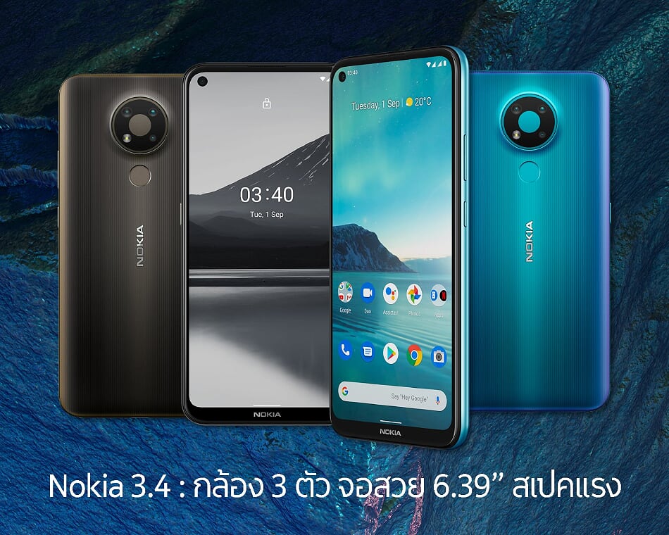 Nokia 3.4 เปิดตัวอย่างเป็นทางการในต่างประเทศเมื่อปลายเดือนกันยายนที่ผ่านมา เจาะกลุ่มสมาร์ทโฟนราคาไม่เกิน 5 พันบาทแต่เต็มเปี่ยมไปด้วยประสิทธิภาพการใช้งาน และเป็น รุ่นแรกในซีรี่ส์ที่ใช้หน้าจอแบบ punch-hole ขนาด 6.39 นิ้ว เพิ่มพื้นที่หน้าจอให้ดูกว้างสบายตา ใช้งานต่อเนื่องได้นานถึง 2 วัน ด้วยแบตเตอรี่ขนาด 4,000 มิลลิแอมป์ เพิ่มประสิทธิภาพด้วยกล้องหลังถึง 3 ตัวขนาด 13 ล้านพิกเซล พร้อมเลนส์ Ultra wide ขนาด 5 ล้านพิกเซล และ เลนซ์ Depth ขนาด 2 ล้านพิกเซล ด้วยระบบ AI อัจฉริยะ มาพร้อมโพรเซสเซอร์ Qualcomm® Snapdragon™ 460 ตัวใหม่ล่าสุด หน่วยความจำและการจัดเก็บข้อมูล 4 / 64GB รองรับไมโครเอสดีขนาด 512 GB พอร์ตเชื่อมต่อ USB Type-C ใช้ระบบปฏิบัติการแอนดรอยด์ 10